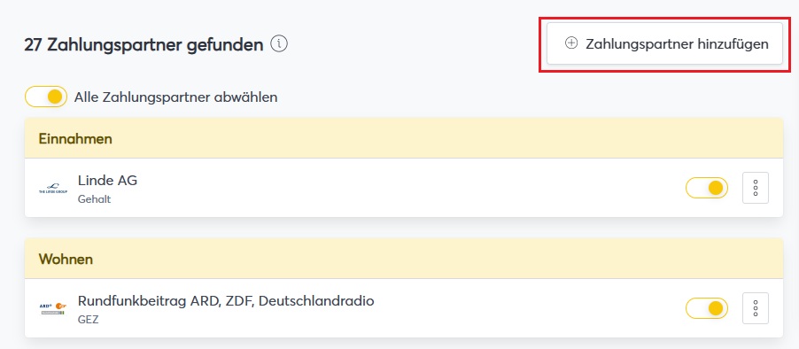 Daher kann es vorkommen, dass nicht alle Zahlungspartner automatisch angezeigt werden. In diesem Fall haben Sie die Möglichkeit, fehlende Zahlungspartner ganz einfach über den Button „Zahlungspartner hinzufügen“ manuell zu ergänzen.