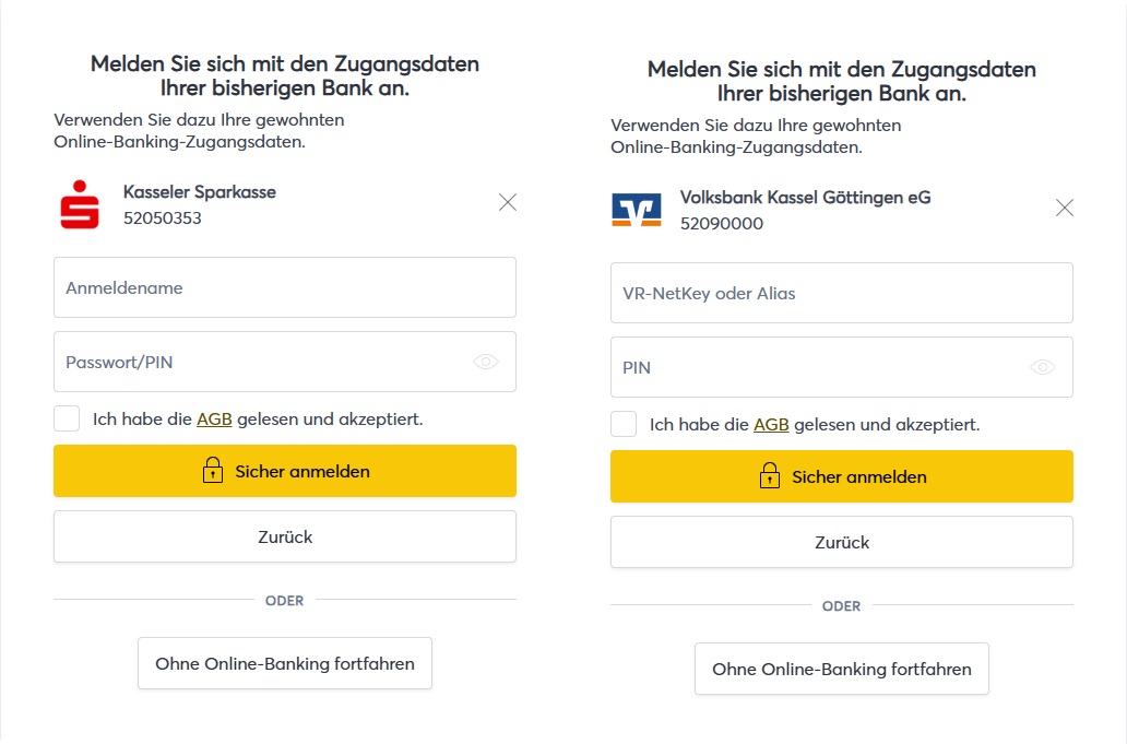 Für einen erfolgreichen Login benötigen Sie die Zugangsdaten für Ihr Online-Banking. Dies ist notwendig, damit Ihre Transaktionen (Zahlungspartner) über den Service abgerufen werden und Sie dadurch bei Ihrem Wechsel wertvolle Zeit sparen können. Die Bezeichnung für den Anmeldenamen ist abhängig von der jeweiligen Bank. Wenn Sie also bspw. Kunde/Kundin bei einer VR-Bank sind, geben Sie hier Ihre VR-Kennung ein und als Sparkassen-Kunde/Kundin bedarf es Ihrer Legitimations-ID.